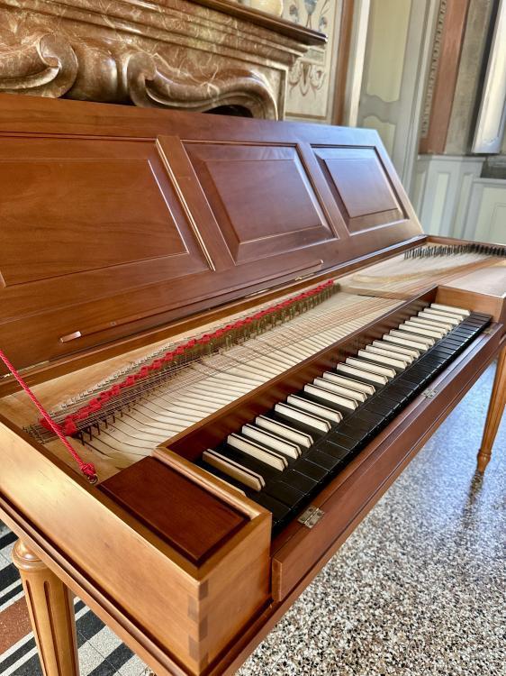 The instrument stands out for its refined decorative character, with an elegant painted case, richly detailed side panels and a set of finely hand-carved legs, faithfully copied from the original models and connected by a shaped underframe.